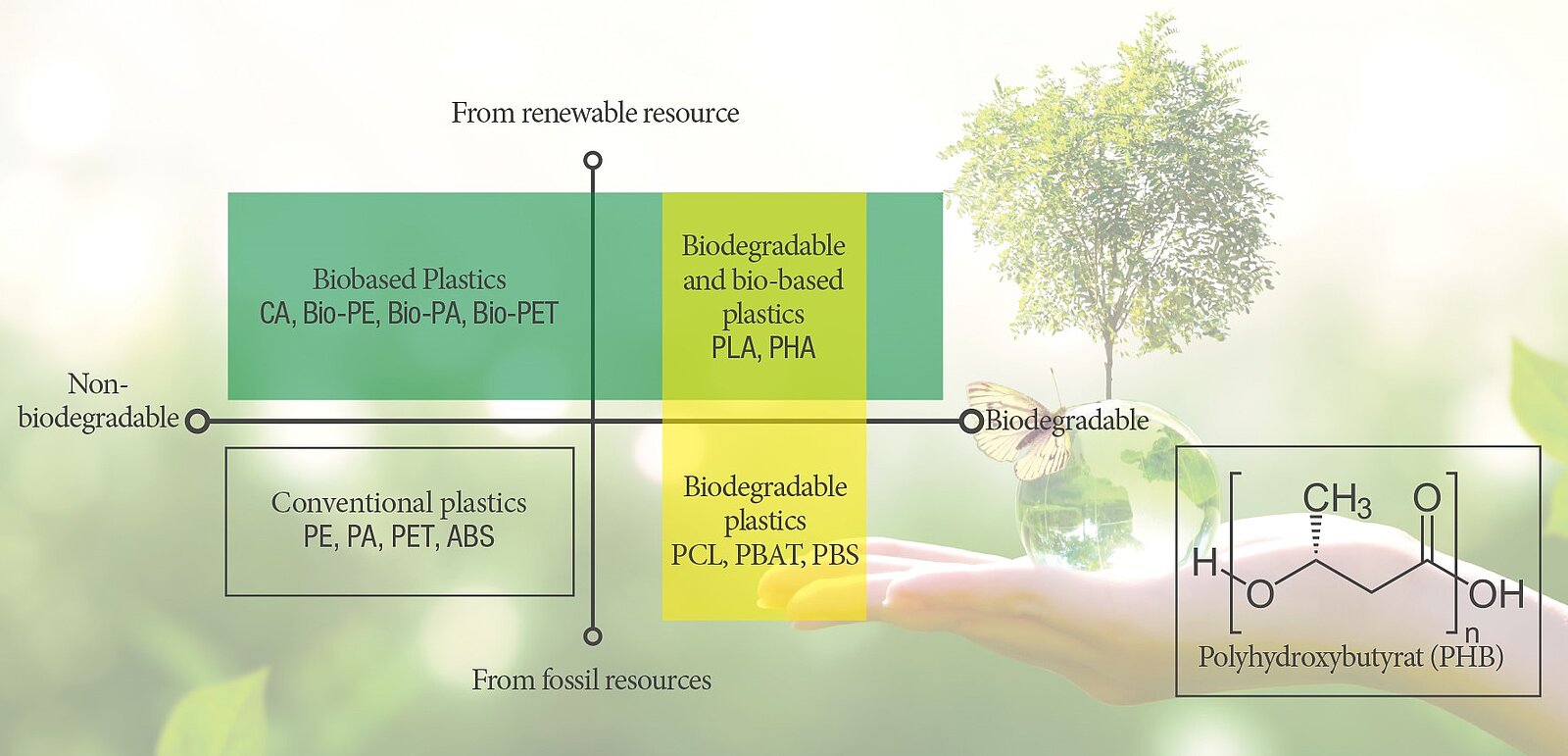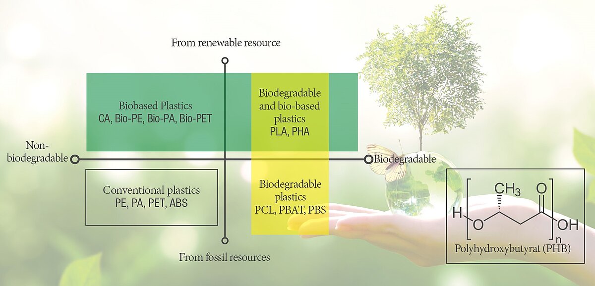 These products, referred to as bioplastics, are differentiated between bio-based and biodegradable: Bio-based plastics are produced from renewable raw materials, such as starch or sugar. The term biodegradable refers to plastics that can be decomposed by microorganisms. This results in the following three groups of bioplastics:
